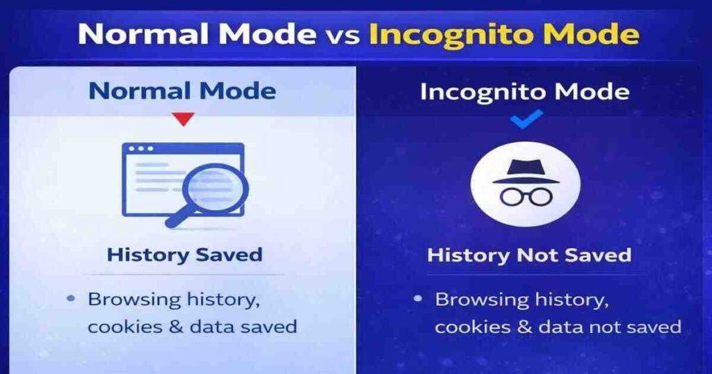 सामान्य ब्राउज़िंग में वेबसाइट आपके ब्राउज़र में cookies सेव कर देती हैं। इससे वेबसाइट आपकी पसंद और गतिविधि को ट्रैक कर सकती है। लेकिन इन्कॉग्निटो मोड में cookies केवल अस्थायी रूप से काम करती हैं। जैसे ही आप इन्कॉग्निटो विंडो बंद करते हैं, सभी cookies अपने-आप हट जाती हैं।